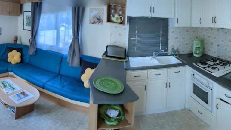Das Mobilheim beinhaltet einen Sitzbereich, einen Satelliten Flachbild-TV sowie ein eigenes Badezimmer mit Dusche und kostenlosen Pflegeprodukten. Es bietet Platz für bis zu vier Personen und ist mit kostenlosem Wifi ausgestattet.