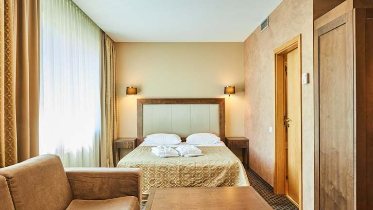Das Hotel bietet klimatisierte und geräumige Zimmer und Suiten, die mit Sat-TV, Minibar und Schreibtisch ausgestattet sind. Alle Zimmer verfügen über ein eigenes Badezimmer mit Fussbodenheizung. Zudem stehen den Gästen diverse Spa- und Wellnesseinrichtungen, wie ein Innenpool und Dampfbäder zur Verfügung.