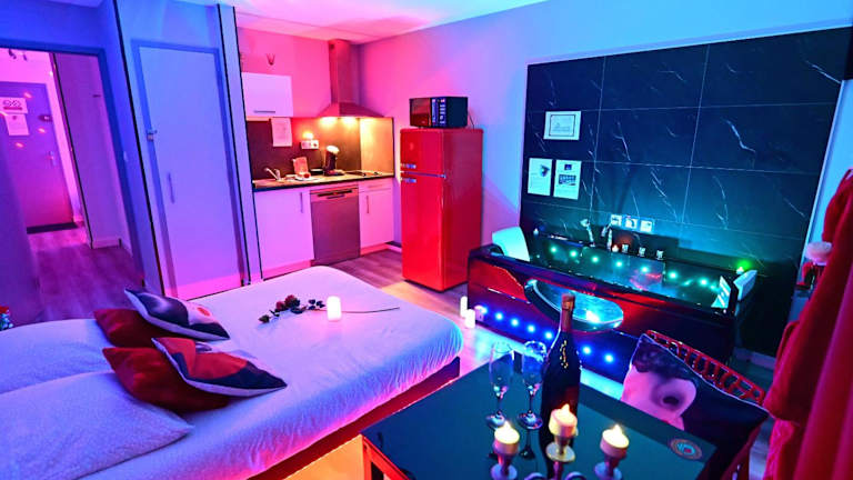 Die Ferienwohnung verfügt über ein Schlafzimmer und ein Badezimmer mit Dusche, Whirlpool und kostenlosen Pflegeprodukten. Die Küche ist mit einem Kühlschrank, Geschirrspüler und Mikrowelle ausgestattet. Zusätzlich gibt es eine Badewanne, Haartrockner und Bademäntel. Parkettböden sorgen für eine angenehme Bequemlichkeit.
