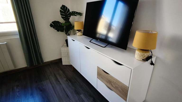 Die Ferienwohnung ist mit einem Wohnzimmer mit einem Flachbild-TV mit Satellitenkanälen ausgestattet. Eine voll ausgestattete Küche mit Kühlschrank und Geschirrspüler sowie ein Badezimmer mit Haartrockner sind ebenfalls vorhanden. Handtücher und Bettwäsche werden bereitgestellt.