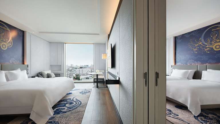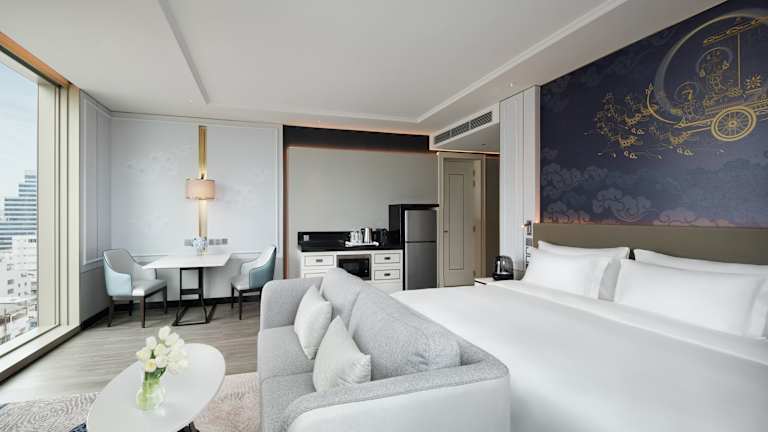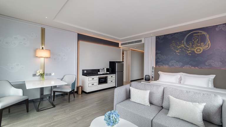 Die Zimmer sind klimatisiert und verfügen über ein behagliches Raumklima. Jedes Zimmer bietet ein Kingsize-Bett, einen Sitzbereich, einen Flachbild-TV mit Satellitenkanälen, einen Safe, eine Minibar sowie eine Tee-/Kaffeestation. Ein Kühlschrank ist ebenfalls vorhanden. Die Badezimmer sind mit einer Dusche, einer Badewanne, kostenlosen Pflegeprodukten, einem Haartrockner und Bademänteln ausgestattet. Die Gäste haben Zugang zu einem kostenlosen WiFi und können Hausschuhe sowie eine Auswahl an Handtüchern nutzen. Familien- und Nichtraucherzimmer sind ebenfalls verfügbar.