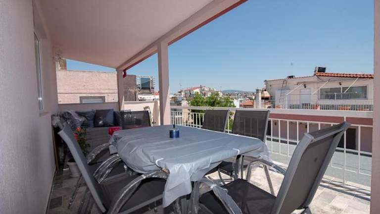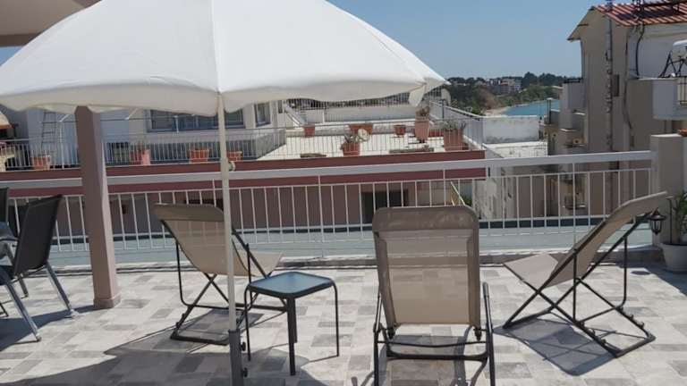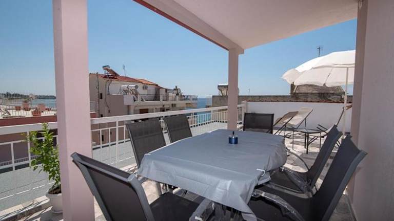Die Ferienwohnung Grcka Reni Greece Beach Penthaus 3 bietet Übernachtungsmöglichkeiten direkt am Strand mit kostenlosem Wifi und Klimaanlage. Sie zeichnet sich durch einen direkten Zugang zu einem Balkon mit Meerblick aus.