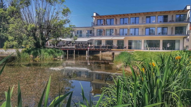Das Hotel bietet ein reichhaltiges Frühstück, das entweder im Hotel selbst oder auf der Sonnenterrasse mit Blick auf den Teich serviert werden kann. Das Frühstück umfasst eine Vielzahl gesunder Produkte wie Säfte und frisches Obst, um den Tag energiegeladen zu beginnen.