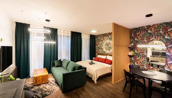Das Green Garden Sauna Apartment bietet eine moderne und gut ausgestattete Ferienwohnung mit einem einladenden Ambiente. Die Gäste können sich auf die Annehmlichkeiten eines kostenlosen Wifis und einer Klimaanlage freuen.