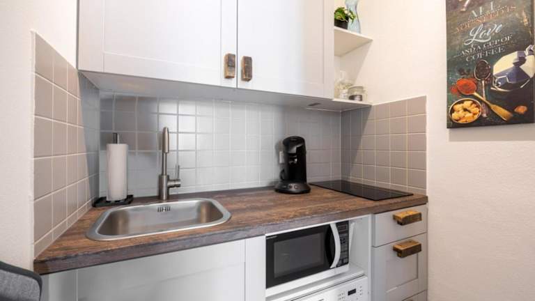 Die Ferienwohnung beinhaltet 1 Schlafzimmer, eine voll ausgestattete Küche mit Kühlschrank und Geschirrspüler sowie 1 Badezimmer mit Dusche und Haartrockner. Handtücher und Bettwäsche werden zur Verfügung gestellt.