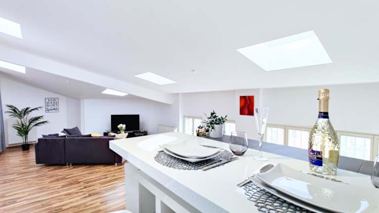 Das Loft besteht aus einem Schlafzimmer, einem Wohnzimmer und einer voll ausgestatteten Küchenzeile, die einen Kühlschrank und eine Kaffeemaschine beinhaltet. Ein Badezimmer mit Badewanne und Haartrockner rundet die Ausstattung ab. Es werden Handtücher und Bettwäsche bereitgestellt.