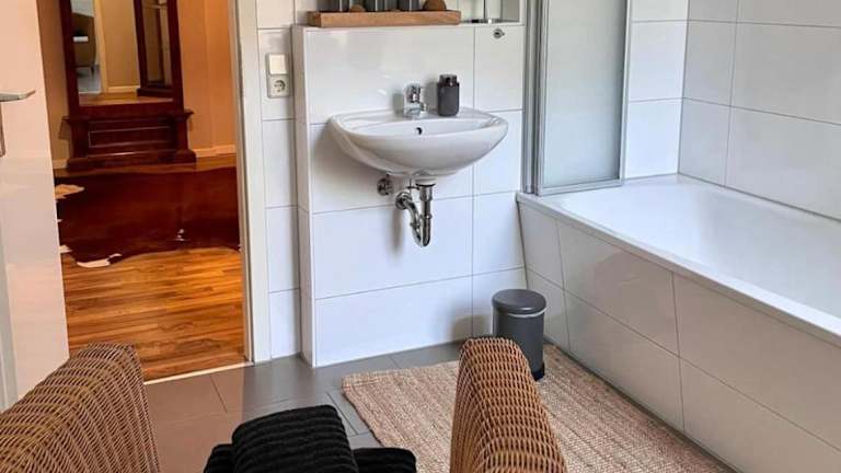 Die Ferienwohnung verfügt über ein Schlafzimmer, ein Wohnzimmer mit einem Flachbild-TV sowie einer voll ausgestatteten Küche mit Kühlschrank und Geschirrspüler. Das Badezimmer ist mit einem Haartrockner ausgestattet. Handtücher und Bettwäsche werden bereitgestellt.
