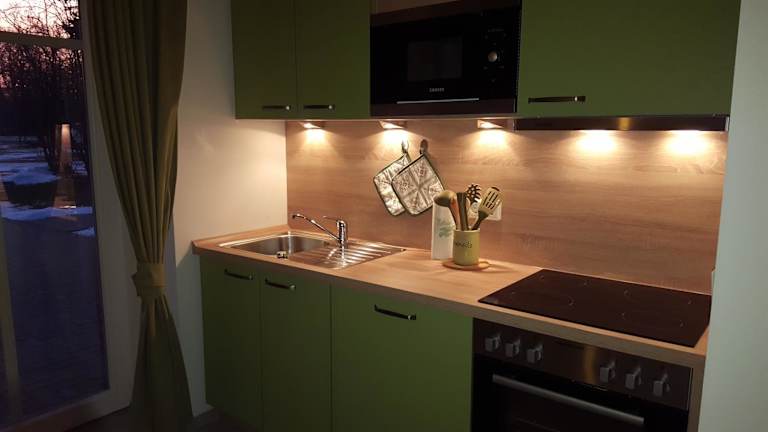 Die Wohneinheiten sind mit einer voll ausgestatteten Küchenzeile, einem Esstisch, einem Flachbild-TV mit Satellitenkanälen sowie einem eigenen Badezimmer ausgestattet. In jedem Zimmer stehen ein Kühlschrank, ein Geschirrspüler, ein Ofen, eine Kaffeemaschine und ein Wasserkocher zur Verfügung.