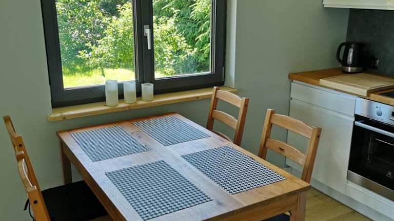 Grzybowo Dom wakacyjny bietet Übernachtungsmöglichkeiten in einem Ferienhaus mit Terrasse und Seeblick. Die Unterkunft hat ein einladendes Ambiente, ideal für Familien und Gruppen. Die Besonderheiten umfassen eine gut ausgestattete Gemeinschaftsküche und eine Unterkunft für Haustiere auf Anfrage.