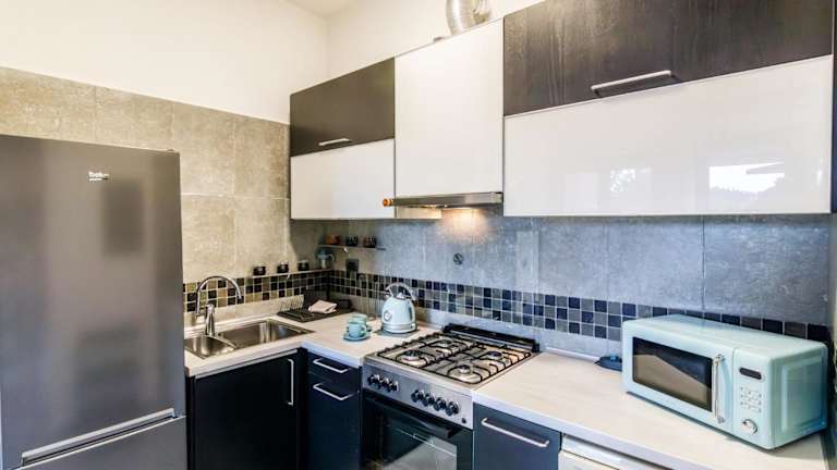 Die Wohnung ist ausgestattet mit 2 Schlafzimmern und einer Küchenzeile, die mit einem Kühlschrank und einem Geschirrspüler ausgestattet ist. Zudem stehen 2 Badezimmer mit einem Bidet, einem Haartrockner und einer Waschmaschine zur Verfügung. Ein Flachbild-TV ergänzt die Ausstattung der Ferienwohnung.