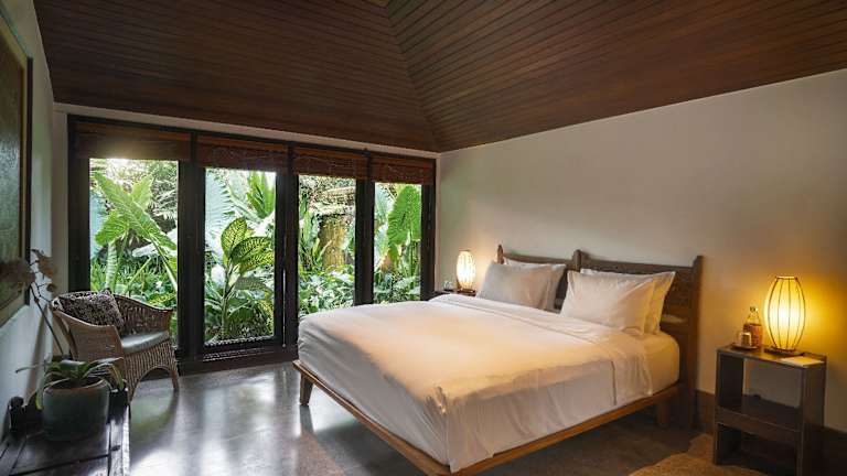 Die klimatisierten Schlafzimmer befinden sich in 2 separaten Pavillons. Die Zimmer bieten einen Blick auf den Pool oder den Garten. Jedes Zimmer verfügt über ein eigenes halboffenes Badezimmer mit einer Warm-/Kaltwasser-Regendusche. Ein Fischteich im eigenen Garten sorgt für eine entspannende Stimmung.