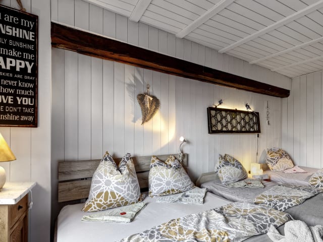 2 Zimmer für je max. 4 Personen in 1 Stock des Guesthouses Scadena mit je - 1 französischen Doppelbett (1.40 x 2 m) - 2 Einzelbetten (0.90 x 2 m) mit Gemeinschaftsbadezimmer auf demselben Stock HD-TV, Wasserkocher, Kaffeemaschine, Tee sind im Preis inbegriffen. Hunde übernachten gratis.