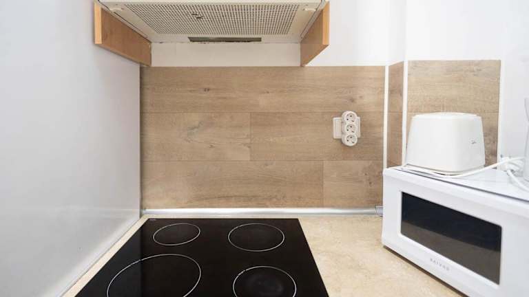 Eine voll ausgestattete Küche mit Kühlschrank und Wasserkocher steht zur Verfügung, um Selbstverpflegung zu ermöglichen.