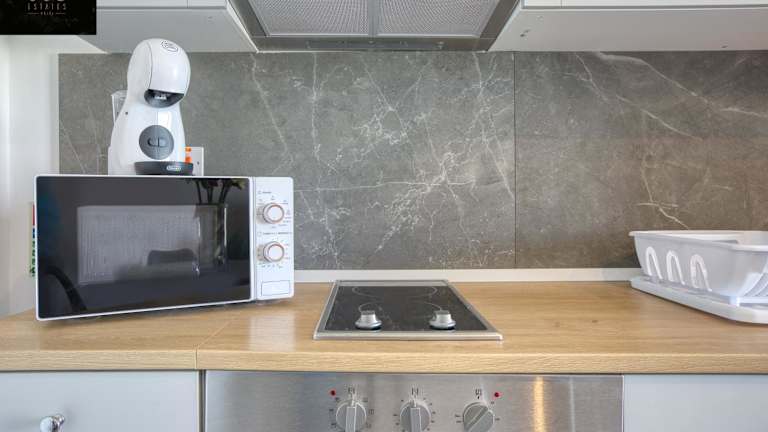 Die Unterkunft verfügt über eine voll ausgestattete Küche mit Kühlschrank, Ofen, Mikrowelle, Herdplatte, Toaster, Kaffeemaschine und Wasserkocher, sodass Gäste selbstständig zubereiten können. Es sind keine Verpflegungsangebote angegeben.