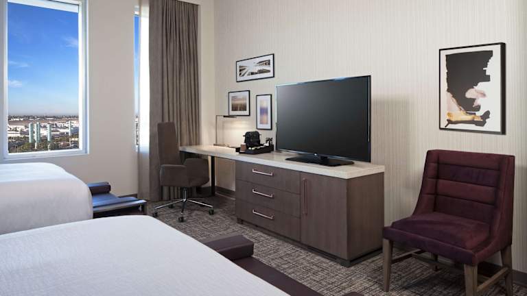 Die Zimmer im H Hotel Los Angeles, Curio Collection by Hilton sind geräumig und stilvoll eingerichtet. Sie bieten entweder ein Kingsize-Bett oder zwei Queensize-Betten sowie Annehmlichkeiten wie kostenloses WLAN, einen 55-Zoll-HD-TV, Premium-Kabel-TV, einen Getränkekühler, eine Nespresso-Maschine, Pflegeprodukte von Temple Spa und einen Schreibtisch mit ergonomischem Stuhl. Es stehen auch Suiten mit einem Schlafzimmer zur Verfügung.