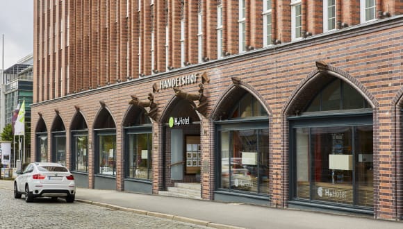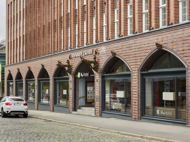 H+ Hotel Lübeck Am Bahnhof 12-14 23558 Lübeck Das H+ Hotel Lübeck City Centre ist ein modernes Hotel der 4 Sterne Kategorie mit 96 Zimmern. Das Hotel befindet sich in den Mauern des 1924 erbauten und als denkmalgeschützten Handelshofes. Es greift viele Elemente der damaligen Architektur auf und integriert diese stilvoll. So finden sich an vielen Stellen historische Einbauten, große Eichentüren, hölzerne Wandverkleidungen und Stuckarbeiten wieder. Die Eröffnung als modernes Hotel erfolgte im Jahr 2009.