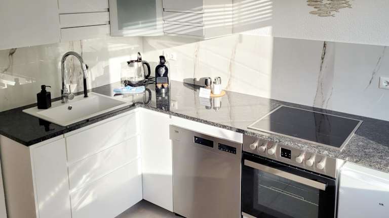 Die Ferienwohnung verfügt über ein Schlafzimmer und bietet einen Flachbild-TV mit Kabelkanälen. Die gut ausgestattete Küche beinhaltet einen Kühlschrank und einen Geschirrspüler. Ein Badezimmer mit Dusche ist ebenfalls vorhanden. Bettwäsche und Handtücher sind nicht im Zimmerpreis inbegriffen, können aber gegen eine Gebühr von 25 EUR gemietet werden.