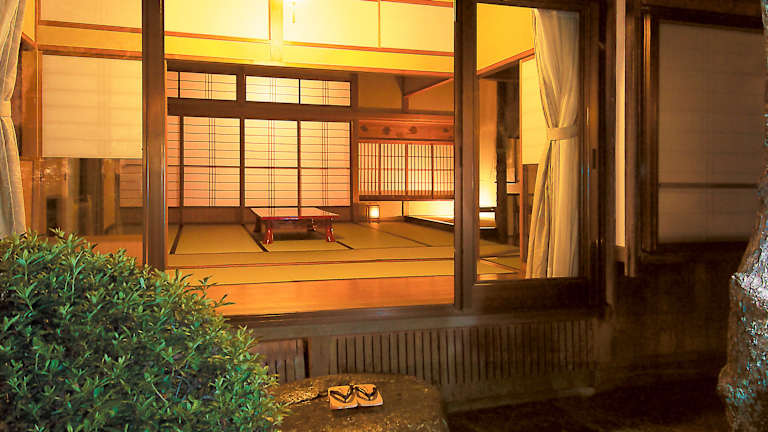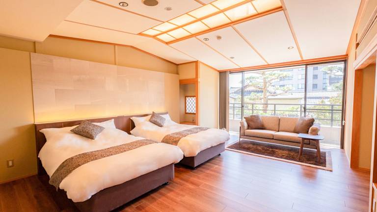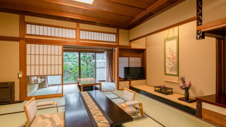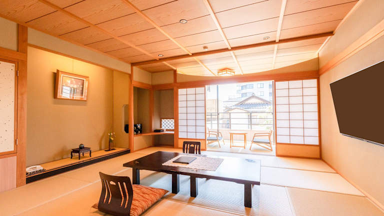 Die Zimmer sind traditionell eingerichtet und verfügen über einen Tatamiboden aus gewebtem Stroh sowie über Futons. Shōji-Schiebeelemente ermöglichen den Zugang zu einem Sitzbereich, der mit einem LCD-TV, einem kleinen Kühlschrank und einem eigenen Bad ausgestattet ist.