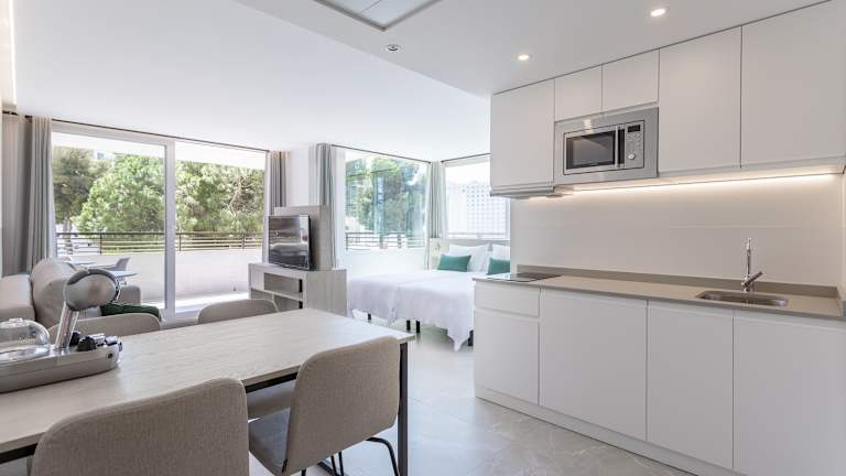 Die Zimmer sind mit einem Wohnzimmer, einer gut ausgestatteten Küche und einem Badezimmer ausgestattet. Eine Klimaanlage und eine Heizung sorgen für ein behagliches Raumklima. In den meisten Zimmern gehört eine Terrasse zur Ausstattung. Ein Sofabett ermöglicht angenehme Nächte, während Kinderbetten für die jüngsten Gäste bereitstehen. Zu den Annehmlichkeiten gehören auch eine Mikrowelle, eine Tee-/Kaffeemaschine, ein Flachbildschirmfernseher sowie Wifi ohne Gebühr. Die Badezimmer sind mit einer Dusche und Haartrockner sowie Kosmetikartikeln ausgestattet. Das Apartmenthotel bietet Nichtraucherzimmer.