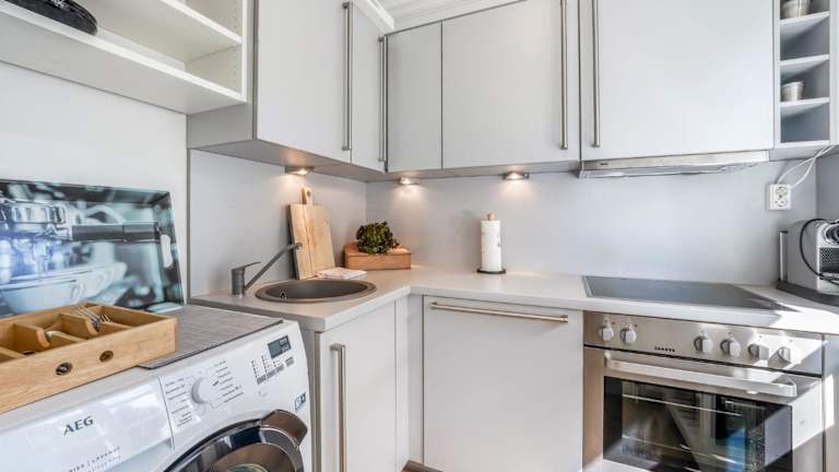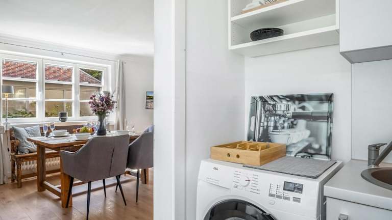 Die Ferienwohnung besteht aus 1 Schlafzimmer, einem Wohnzimmer sowie einer voll ausgestatteten Küche mit Kühlschrank und Wasserkocher. Ein Badezimmer mit Dusche und Haartrockner ist ebenfalls vorhanden. Handtücher und Bettwäsche werden bereitgestellt, was für zusätzlichen Komfort sorgt.