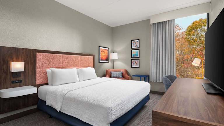 Die Zimmer sind mit Klimaanlage und individuell steuerbarer Heizung ausgestattet. Sie verfügen über Teppichboden, ein Doppelbett oder Kingsize-Bett sowie einen Schreibtisch. Zudem sind ein Kühlschrank, eine Mikrowelle, eine Tee-/Kaffeemaschine und ein Bügelset vorhanden. Das Badezimmer bietet eine Dusche und Badewanne sowie Kosmetikartikel. Es sind auch rollstuhlgerechte Zimmer mit barrierefreien Badezimmern verfügbar. Das Hotel führt Familien- und Nichtraucherzimmer.