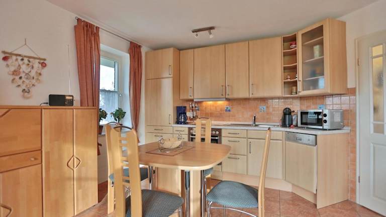 Die Ferienwohnung umfasst ein Schlafzimmer sowie ein Wohnzimmer und verfügt über eine gut ausgestattete Küche mit Kühlschrank und Geschirrspüler. Zudem ist ein TV vorhanden, was den Gästen zusätzliche Bequemlichkeit bietet.