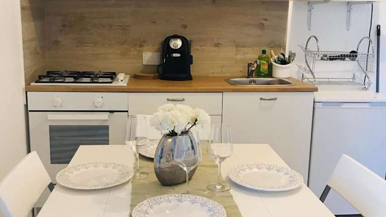 Die Ferienwohnung besteht aus einem Schlafzimmer, einem Wohnzimmer und einer voll ausgestatteten Küche mit Kühlschrank und Kaffeemaschine. Zur Ausstattung gehören ebenfalls ein Badezimmer mit Bidet und Dusche sowie eine Veranda/Patio. Handtücher und Bettwäsche werden bereitgestellt und Klimaanlage sorgt für die nötige Bequemlichkeit.