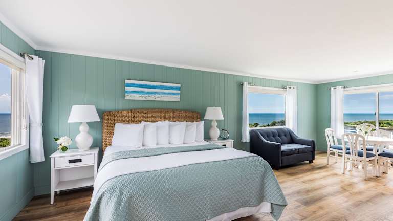Die Zimmer verfügen über einen Balkon mit Meerblick, eine Essecke und eine vollständig ausgestattete Küche.