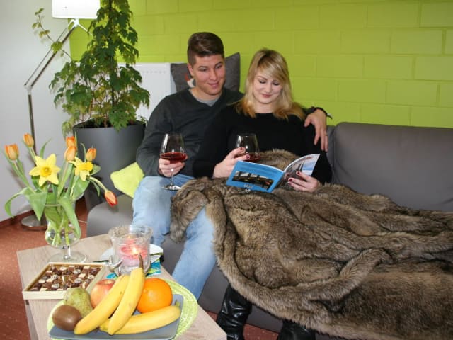 Vom ersten Moment an wohlfühlen! In unseren Ferienhäusern erwarteten Sie mit Liebe zum Detail eingerichtete und ebenerdige Ferienapartments. Beide FEWO´s sind auf Wunsch zum Teil mit einer Verbindungstür begehbar für eine max. Belegung von 6 erwachsene Personen. Die Apartments sind ebenerdig und barrierefrei! WILLKOMMEN - der Eingangsbereich mit Flur und Fußbodenheizung Im Flur befindet sich ein Hotel-Card-Schalter, über den Sie mittels Ihrer Check-In-Card den Stromfluss aktivieren. Unsere Beleuchtung wird durch neueste LMD-Strahler-Technik per Bewegungsmelder gesteuert. Keine lästige Lichtschaltersuche im Flur mehr! Ihr Wohlfühl-Schlafzimmer mit extra hohem und komfortablem Boxspring-Doppelbett Im Wohlfühlschlafbereich erwartet Sie für ein entspannendes Schlafgefühl ein hochwertiges Boxspringdoppelbett von 1.80 m x 2,00 m Größe und ein geräumiger Schiebetürenschrank. Der zeitgemäße und moderne Wohnbereich mit funktionaler Küche, Essplatz und Leseecke Modern, großzügig und komfortabel ausgestattet, finden Sie alles was man für einen entspannenden Urlaub benötigt. Der Wohn- und Küchenbereich ist mit einer Küche inkl. Geschirrspüler, Ceranfeldherd, Backofen, Kaffeemaschine, Toaster, Wasser- und Eierkocher, Kühlschrank mit Gefrierfach ausgestattet. Neben dem Essplatz für 4 Personen befindet sich eine Couch mit Sessel und Fußhocker, sowie ein 32-Zoll-Flat-TV mit neuester SAT-Anlage/HDTV/freie Sender in HD sowie Musikcenter mit CD/MP3/Radio/USB-Port. Ihr Wohlfühlbad mit Hotelcharakter! Das Badezimmer mit verglaster Dusche, WC, Fön, Kosmetikspiel, Bademantel und Kosmetiktücherbox erinnert mit seinem Komfort an Aufenthalte im Hotel. Platz für Ihre persönlichen Hygieneartikel finden Sie auf dem exklusiven Mineralgusswaschtisch. Unser besonderes Extra für Sie: das Bad-Set mit kleinen Kosmetikartikeln für ZWEI - kostenlos dazu! Eine Fußbodenheizung sorgt im Bad für angenehme und gleichbleibende Wärme, der Handtuchwärmer steht Ihnen zusätzlich zur Verfügung. Der Duscheinstieg ist ebenerdig (barrierefrei) bequem gestaltet und ein Hocker bietet eine zusätzliche Ablagefläche. Die Sonnenterasse - lädt ein zum Grillen oder einfach nur die Sonne genießen! Eine Terrasse mit Garten direkt vom Wohnbereich begehbar, gehört zur Fewo dazu. Gartenmöbel mit Auflagen, Sonnenschirm, zwei Sonnenliegen sowie ein Kugelgrill stehen für Sie zur kostenfreien Nutzung bereit.