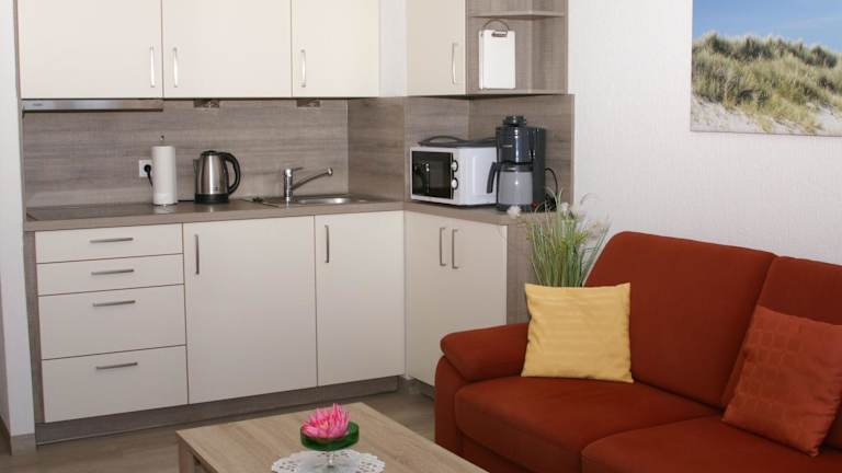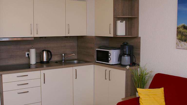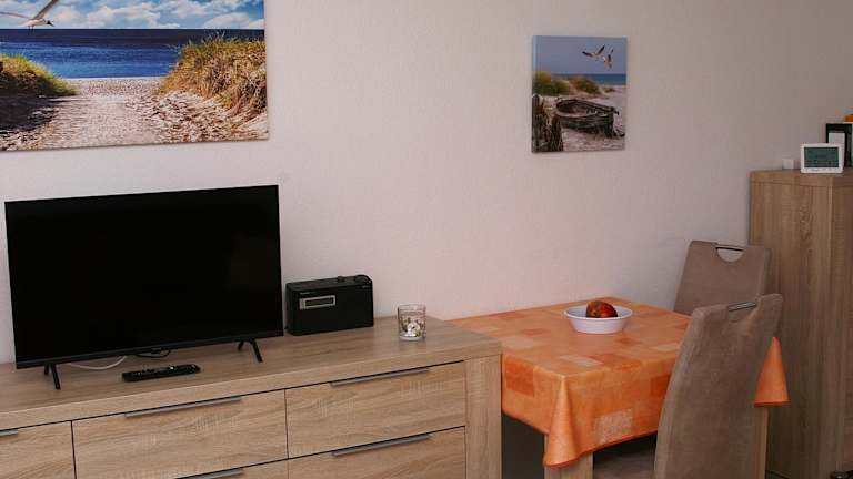 Die Ferienwohnung umfasst 1 Schlafzimmer, eine Küche mit Kühlschrank, einen Sitzbereich sowie ein Badezimmer mit Dusche. Ausserdem ist ein TV vorhanden.