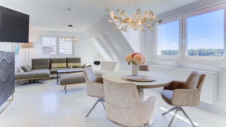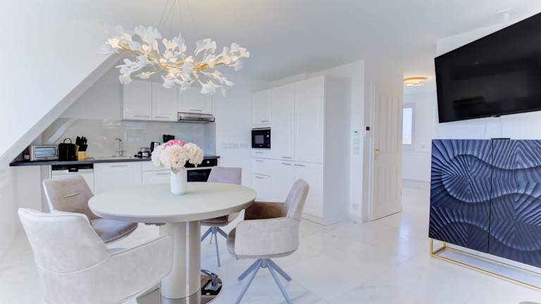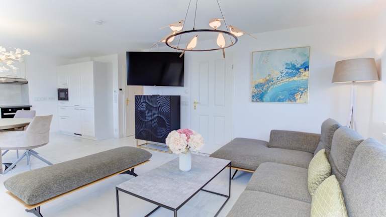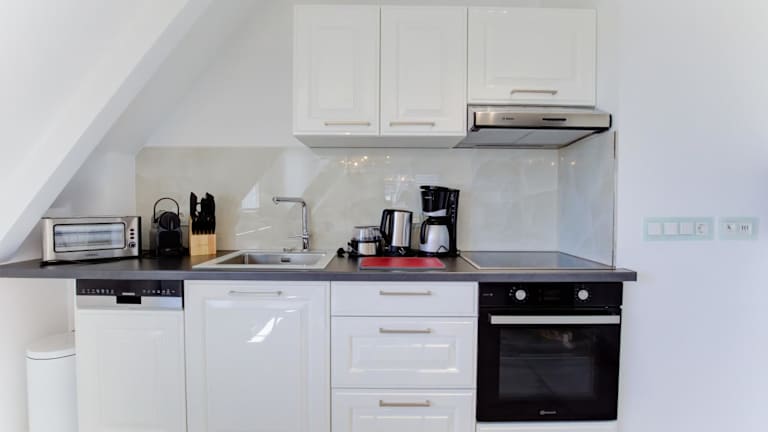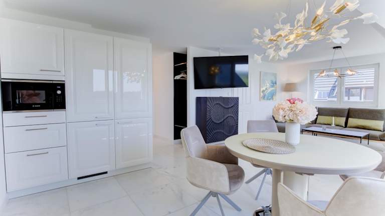 Die Ferienwohnung ist mit zwei Schlafzimmern ausgestattet und verfügt über eine voll ausgestattete Küchenzeile, die einen Kühlschrank, Geschirrspüler, Waschmaschine, Ofen und Mikrowelle umfasst. Zudem sind ein Flachbild-TV sowie Handtücher und Bettwäsche verfügbar.