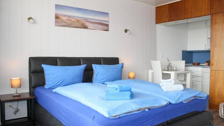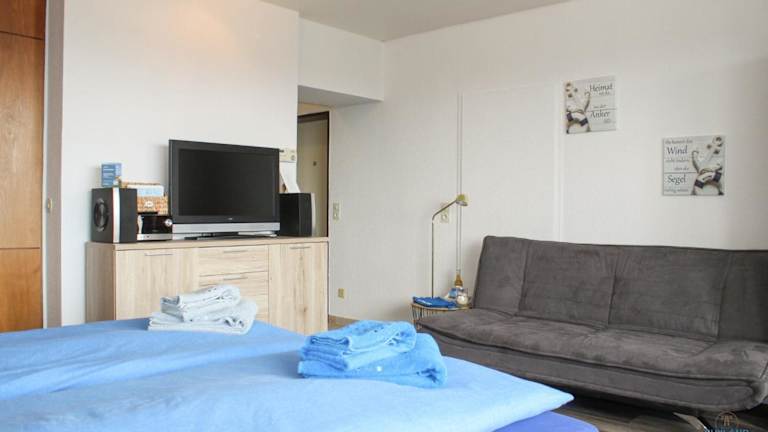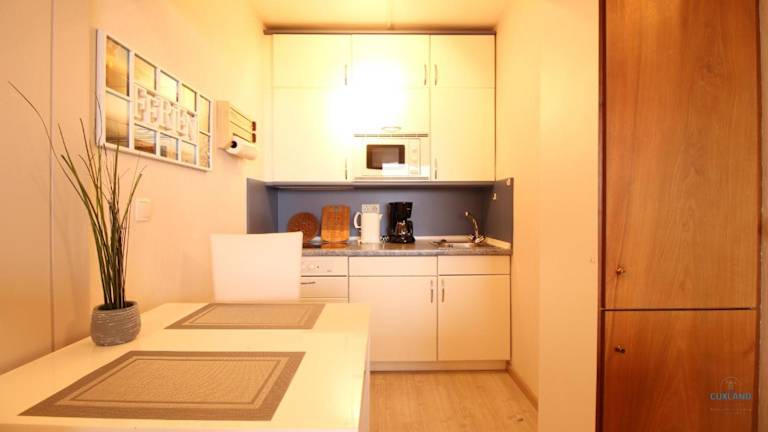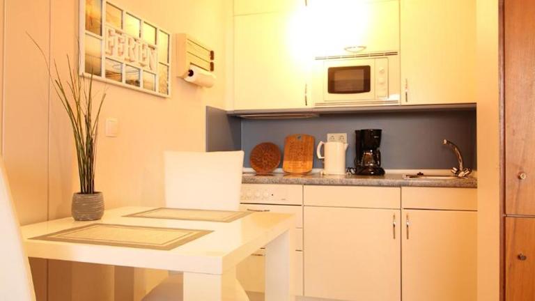 Die Ferienwohnung von Haus Atlantic Whg. 607B ist mit einem Wohnzimmer und einer voll ausgestatteten Küche versehen, die über einen Kühlschrank, eine Mikrowelle und einen Wasserkocher verfügt. Zur Ausstattung gehört zudem ein TV.