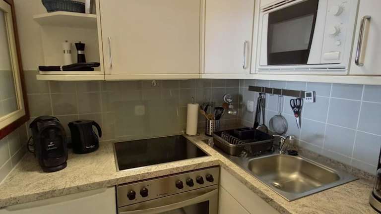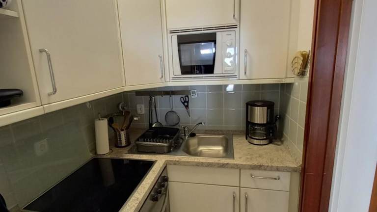 Die Küchenzeile der Ferienwohnung ist ausgestattet mit einem Kühlschrank, einem Ofen, einer Mikrowelle sowie einer Kaffeemaschine und einem Wasserkocher, um die Selbstverpflegung zu ermöglichen.
