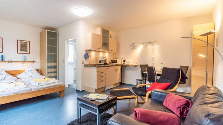 Die Ferienwohnung ist ausgestattet mit einem gemütlichen Wohnzimmer und einer voll ausgestatteten Küche, die über einen Kühlschrank und eine Mikrowelle verfügt. Handtücher und Bettwäsche werden zur Verfügung gestellt.