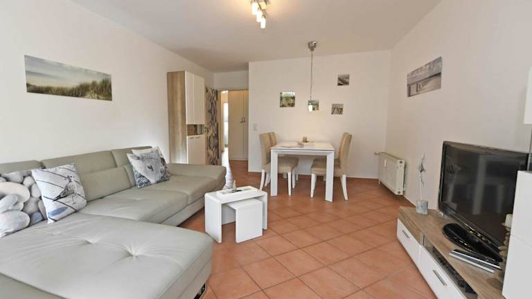 Die Ferienwohnung umfasst zwei Schlafzimmer, ein Wohnzimmer mit einem TV mit Satellitenkanälen sowie eine voll ausgestattete Küche, die mit einem Kühlschrank und einem Geschirrspüler ausgestattet ist. Es gibt zudem ein Badezimmer mit einer Dusche. Es wird darauf hingewiesen, dass Bettwäsche und Handtücher nicht im Preis inbegriffen sind und die Gäste selbst mitbringen oder gegen Aufpreis buchen können.