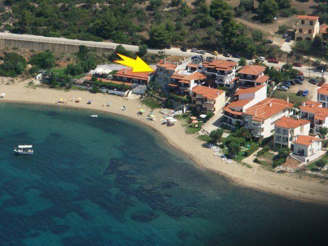 Das Haus des Vaters ist eine der besten Anlagen, die wir im Angebot haben. Der Inhaber führt das Haus nach deutschen Maßstäben. Er hat das Hotel in den 90ern ursprünglich für sich und seine Kinder gebaut und ausgestattet. Inzwischen haben sich die Kinder in anderen Berufen entwickelt und leben heute in Thessaloniki. Nur dadurch sind wir in der Lage, Ihnen dieses einmalige Haus anbieten zu können. In einer malerischen Bucht zwischen dem 1 Finger der Chalkidiki (Kassandra) und der Mönchsrepublik Athos gelegen verfügt das Haus über direktem Strandzugang. Bis zum Meer sind es nur 5 Meter. Die Bucht ist windgeschützt und bietet puderfeinen weißen Sandstrand. Es handelt sich um eine außergewöhnliche schöne Umgebung, die keine Wünsche offen läßt. Genießen Sie am Strand oder aber auf Ihrer Terrasse ein ausgiebiges Frühstück zum Sonnenaufgang oder ein Glas Wein zum Sonnenuntergang, beides wird unvergesslich bleiben. Parkplätze für den mitgebrachten Wagen oder aber für den Leihwagen sind am Haus vorhanden. Eine großartige Möglichkeit in Griechenland Urlaub zu machen, wenn Sie wollen rund um die Uhr in Badekleidung. Der Strand und das Meerwasser sind auch im Jahr 2009 für ihre sehr gute Qualität mit der blauen Flagge ausgezeichnet worden. Rundum ein Urlaubsdomizil, das keine Wünsche offen läßt. Das bedeutet Sandstrand vom feinsten, türkis blaues Wasser und flach abfallende Strandabschnitte. Unser Büro ist nur ca. 800 m. vom Haus des Vaters entfernt, so dass wir mit all unseren Serviceleistungen und Angeboten zur Verfügung stehen. Der ortsansässige Bäcker Nikos Karpetis fährt täglich um ca. 9:00 Uhr mit seinem kleinen Lieferwagen das "Haus des Vaters" an, bietet backfrische Brötchen und andere Leckereien an. So können unsere Gäste jeden Morgen auf Ihren Terrassen oder Balkonen, mit Aussicht auf