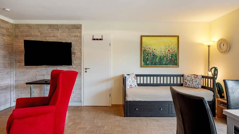 Die Ferienwohnung umfasst ein Schlafzimmer, ein Wohnzimmer sowie eine voll ausgestattete Küche, die mit Kühlschrank und Kaffeemaschine ausgestattet ist. Das Badezimmer verfügt über eine Dusche und kostenlose Pflegeprodukte. Zur weiteren Ausstattung gehören Handtücher und Bettwäsche, die zur Verfügung gestellt werden.