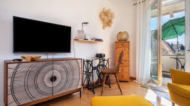 Die Ferienwohnung umfasst 1 Schlafzimmer und 1 Badezimmer und ist ausgestattet mit Bettwäsche, Handtüchern und einem TV mit Kabelkanälen. Eine voll ausgestattete Küche steht den Gästen ebenfalls zur Verfügung, ebenso ein Balkon mit Blick auf den Garten.