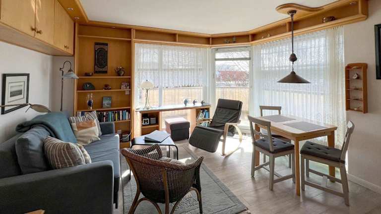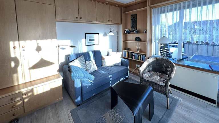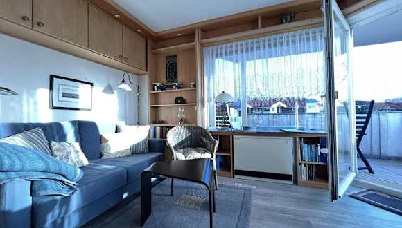 Die Ferienwohnung verfügt über ein Schlafzimmer, ein Wohnzimmer und eine gut ausgestattete Küche, die mit einem Kühlschrank und Geschirrspüler ausgestattet ist. Zudem hat die Wohnung einen Balkon, auf dem Gäste die Aussicht geniessen können. Handtücher und Bettwäsche werden bereitgestellt.