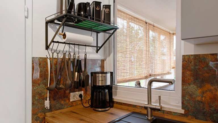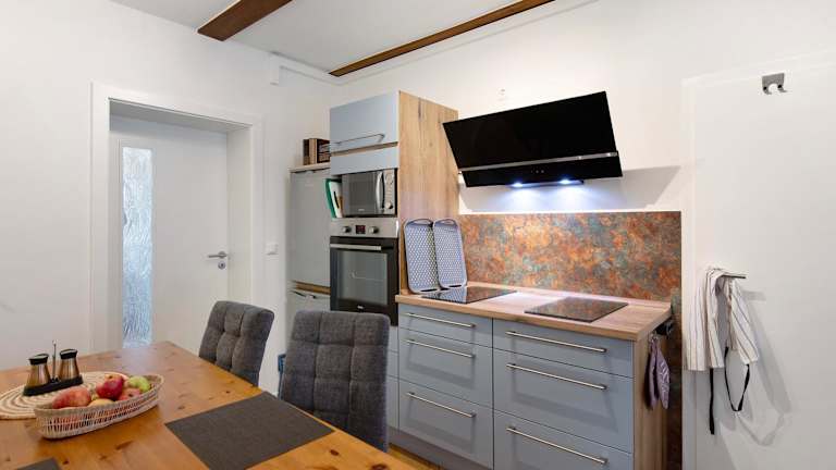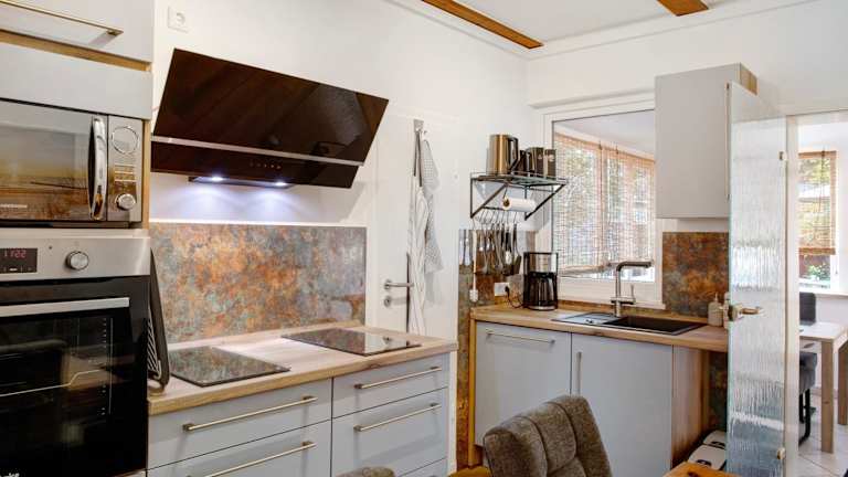 Die Wohneinheiten sind mit Küchen ausgestattet, die einen Kühlschrank, Geschirrspüler, Ofen, Mikrowelle, Herdplatte, Kaffeemaschine und Wasserkocher beinhalten. So können die Gäste selbständig ihre Mahlzeiten zubereiten und in den gemütlichen Küchen essen.