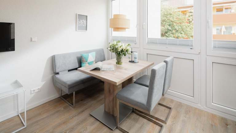 Die Wohnung ist mit einer Küche ausgestattet, die einen Kühlschrank und einen Geschirrspüler beinhaltet. Es sind keine spezifischen Informationen über Verpflegungsmöglichkeiten vorhanden.