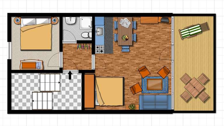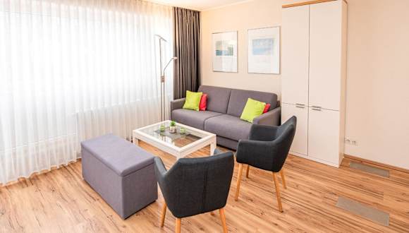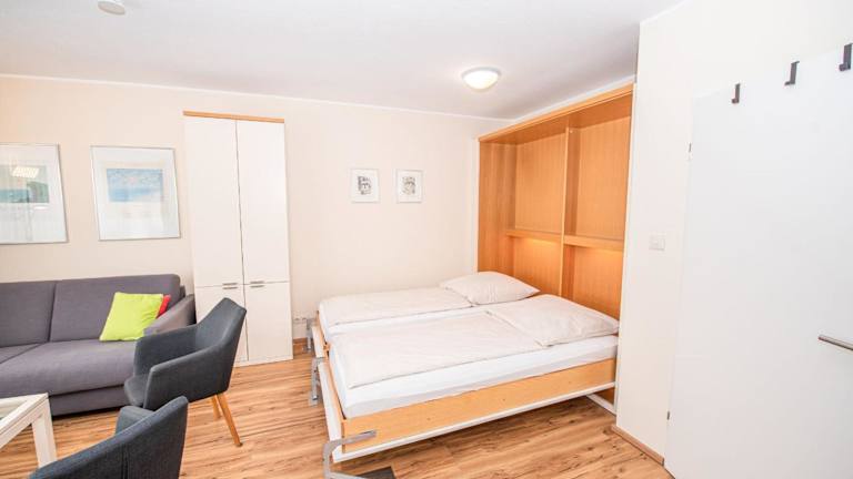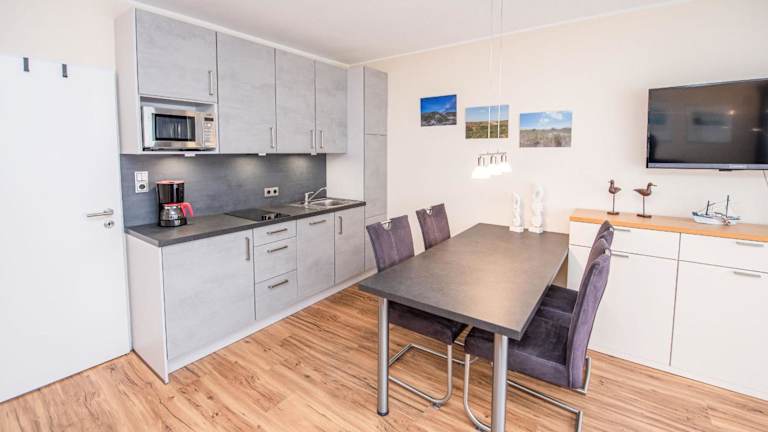 Die Ferienwohnung verfügt über ein Schlafzimmer sowie ein Wohnzimmer mit einem TV mit Kabelkanälen. Eine voll ausgestattete Küche mit Kühlschrank und Geschirrspüler steht ebenfalls zur Verfügung. Zudem ist ein Badezimmer mit Dusche vorhanden. Handtücher und Bettwäsche werden bereitgestellt.