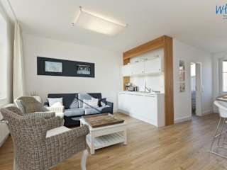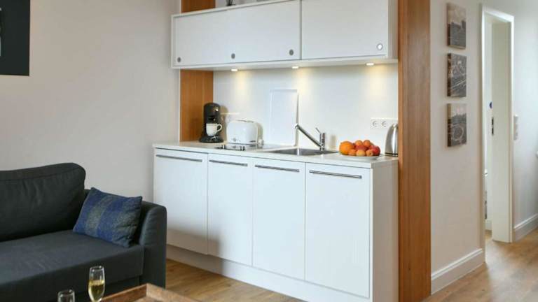 Die Ferienwohnung verfügt über einen Balkon, ein Schlafzimmer, ein Wohnzimmer und eine gut ausgestattete Küche mit Kühlschrank und Geschirrspüler. Die Ausstattung sorgt für Bequemlichkeit während des Aufenthalts.