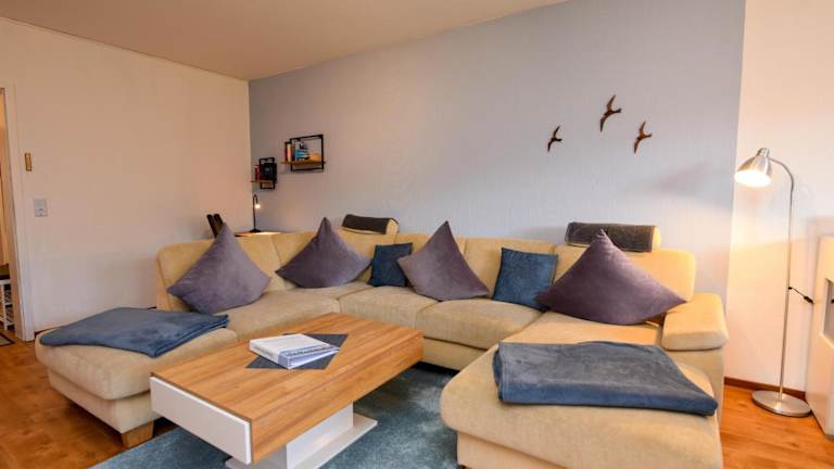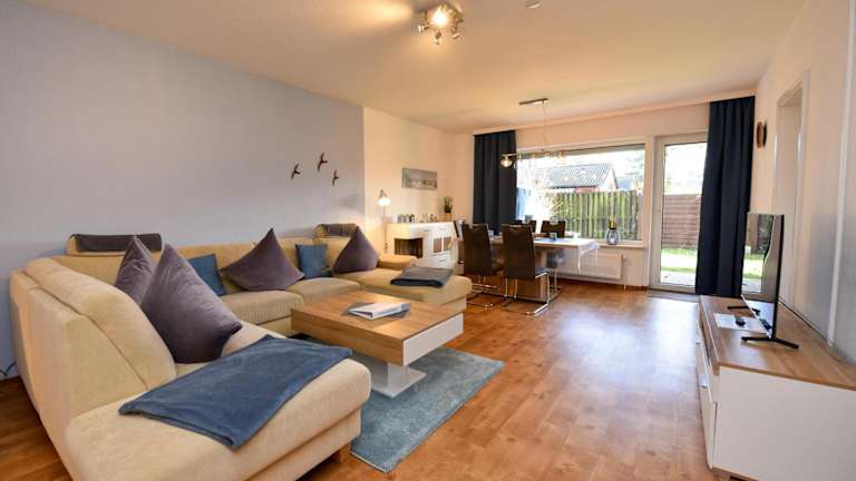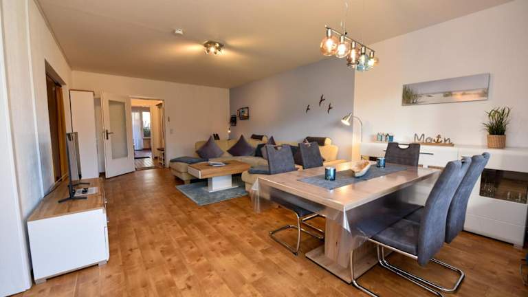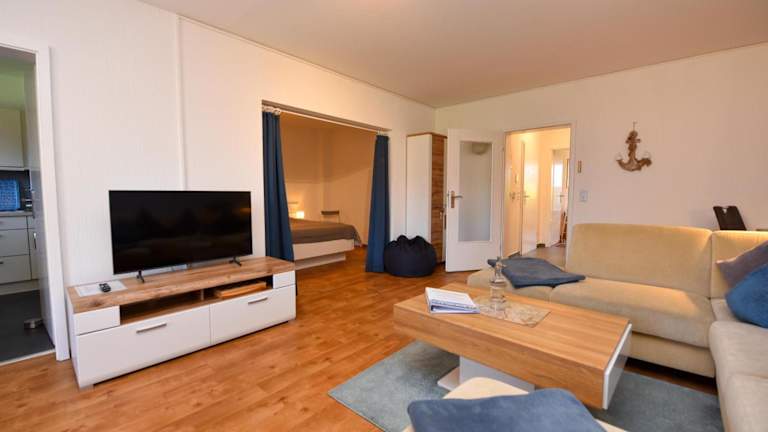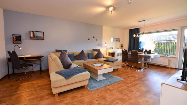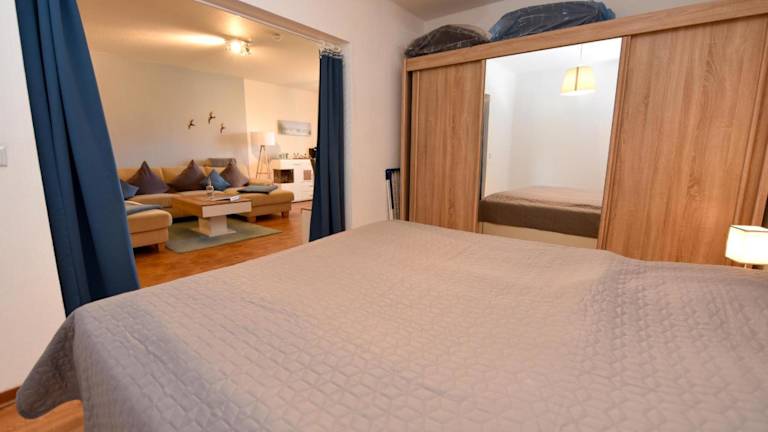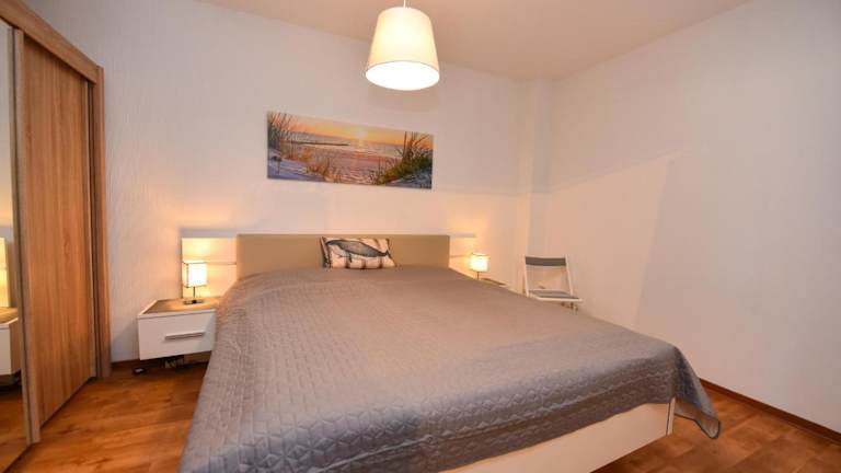 Die Ferienwohnung im Erdgeschoss umfasst 2 Schlafzimmer, eine gut ausgestattete Küche mit Kühlschrank und Geschirrspüler, ein gemütliches Wohnzimmer sowie einen TV. Bettwäsche und Handtücher sind nicht im Zimmerpreis enthalten, können jedoch gegen eine zusätzliche Gebühr von 22 EUR pro Person gemietet oder selbst mitgebracht werden.