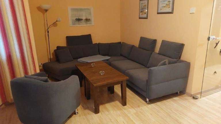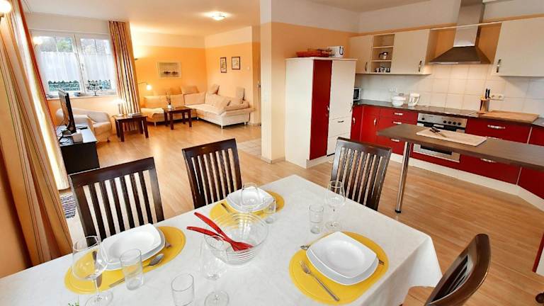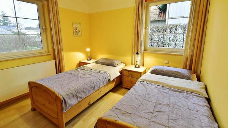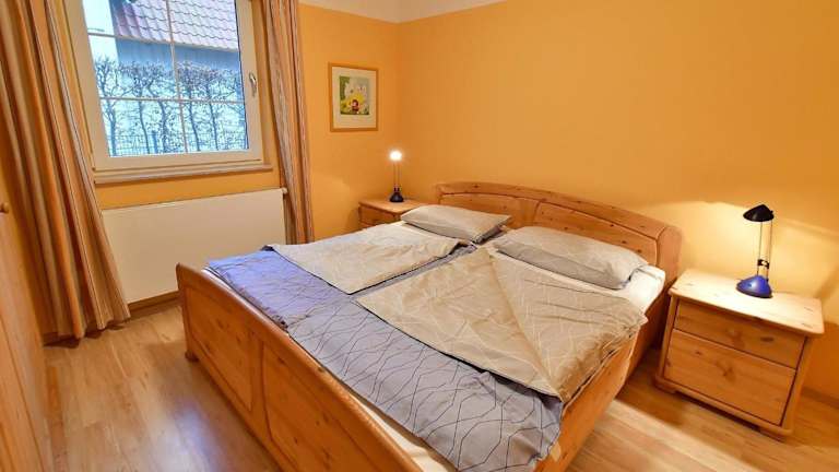 Die Ferienwohnung verfügt über zwei Schlafzimmer und eine Küchenzeile, die mit einem Kühlschrank, einem Geschirrspüler sowie einer Kaffeemaschine ausgestattet ist. Handtücher und Bettwäsche können gegen Aufpreis bereitgestellt werden.