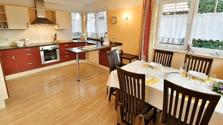 Haus Marleen EG, FW 1 bietet Übernachtungsmöglichkeiten in einer Ferienwohnung mit zwei Schlafzimmern und einer Küchenecke. Die Unterkunft ist gut ausgestattet und bietet Bequemlichkeiten für Gäste.