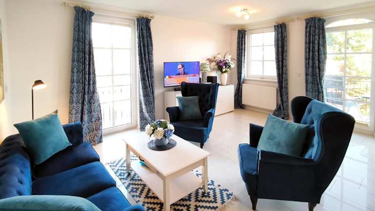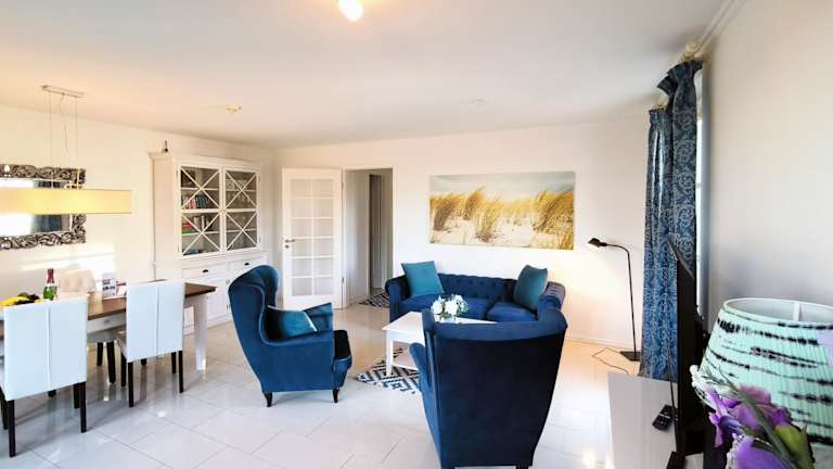 Die Ferienwohnung hat ein Schlafzimmer, ein Wohnzimmer mit einem Flachbild-TV sowie eine gut ausgestattete Küche mit Kühlschrank und Geschirrspüler. Internetzugang über kostenloses WLAN sowie ein privater Balkon mit Meerblick sind vorhanden.
