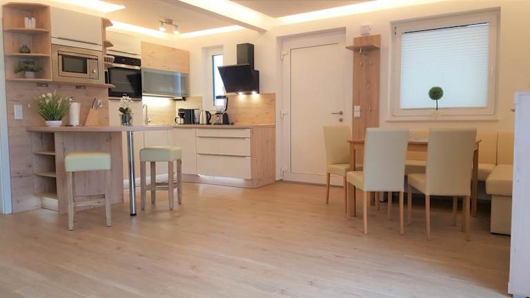 Die Unterkunft bietet eine voll ausgestattete Küche mit Kühlschrank, Geschirrspüler, Ofen, Mikrowelle, Herdplatte, Kaffeemaschine und Wasserkocher, ideal für Selbstversorger.