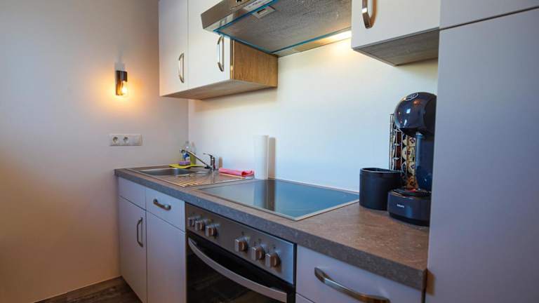 Die Wohneinheiten verfügen über Parkettböden und sind mit einer voll ausgestatteten Küchenzeile ausgestattet. Dazu gehören ein Kühlschrank, ein Geschirrspüler, ein Ofen, eine Mikrowelle sowie eine Kaffeemaschine und ein Wasserkocher. Ein Essbereich, ein Flachbild-TV mit Kabelkanälen und ein eigenes Badezimmer mit Dusche und Haartrockner runden die Ausstattung der Zimmer ab.