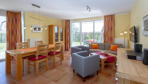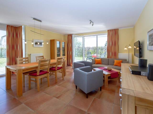 Haus Möwe - Apt. 02 bietet eine Ferienwohnung mit zwei Schlafzimmern, ausgestattet mit einem Wohnzimmer und einem Flachbild-TV mit Kabelkanälen. Die Einrichtung umfasst eine voll ausgestattete Küchenzeile mit Kühlschrank und Geschirrspüler sowie zwei Badezimmer mit Dusche. Die Unterkunft bietet eine gemütliche Terrasse und einen Garten zur Nutzung.